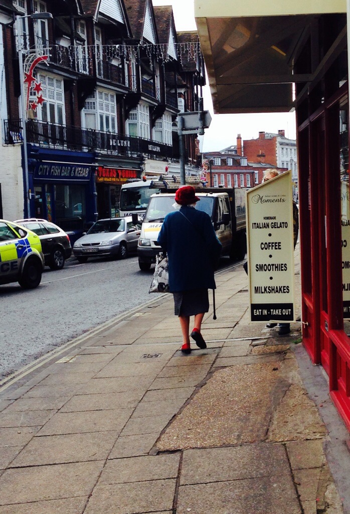 Stylish old lady, passing the street of Winchester